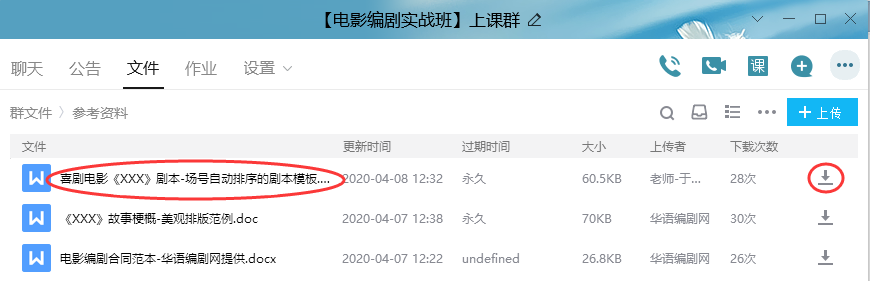 2、找到“喜剧电影《XXX》剧本-场号自动排序的剧本模板”,点击右边的下载图标(如下图),下载完成后会出现一个文件夹图标,点击文件夹图标,就能看到刚下载的文件。